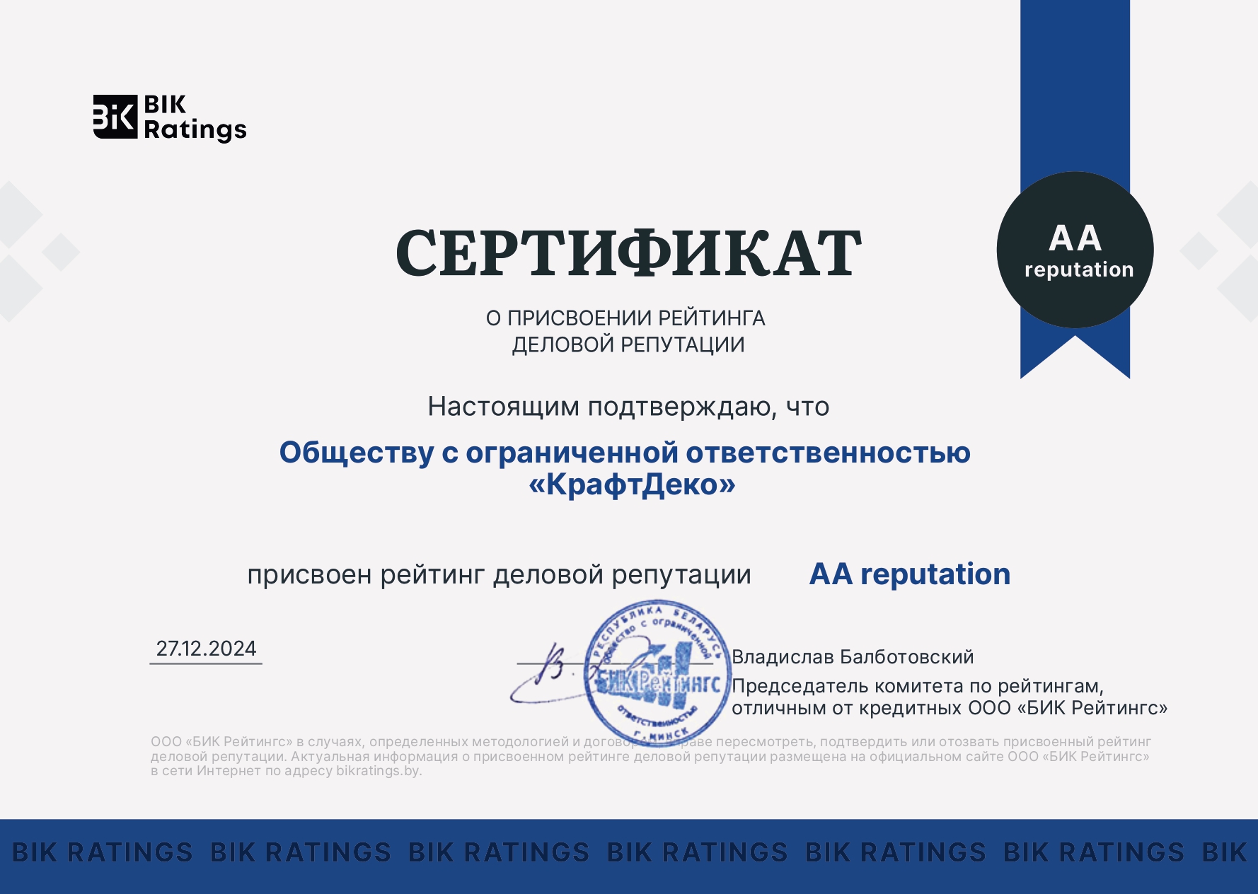 - ООО «КрафтДеко» присвоен рейтинг деловой репутации уровня AA reputation